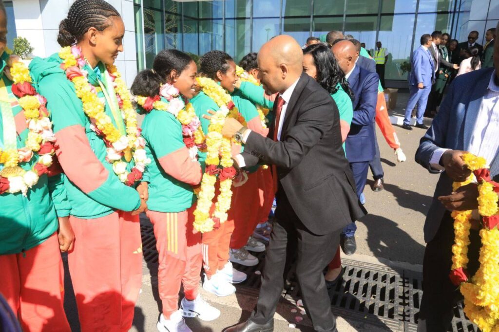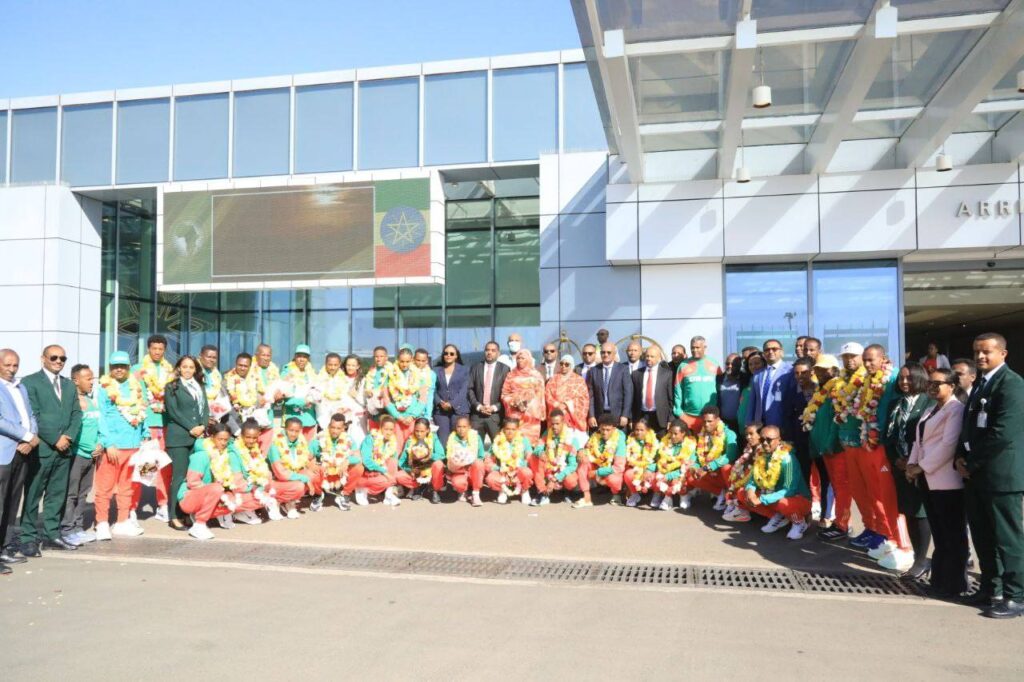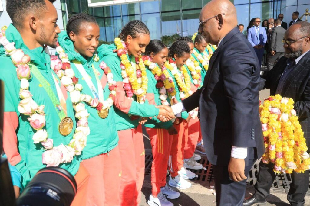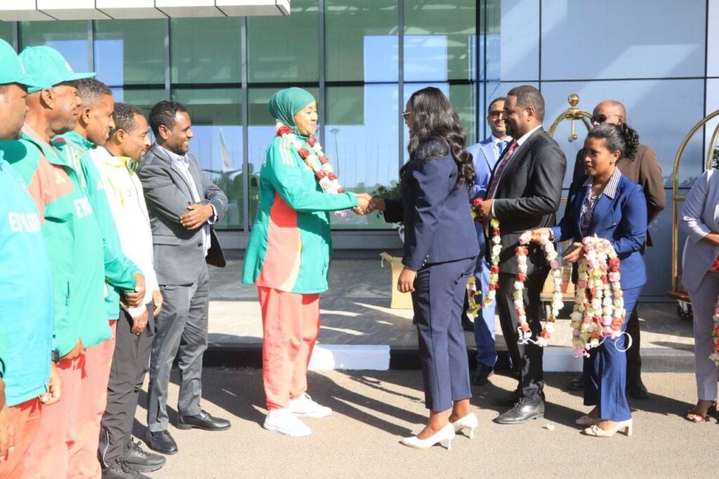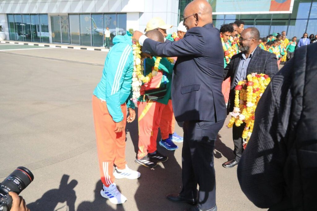ቡዱኑ ቦሌ ዓለም አቀፍ አየር ማረፊያ ሲደርስ የኢ.ፌ.ዴ.ሪ. ባህልና ስፖርት ሚንስትር ሚኒስቴር ክብርት ሸዊት ሻንካ፣ የስፖርት ዘርፍ ሚንስትር ዴኤታው ክቡር መኪዩ ሙሀመድ እና የኢትዮጵያ ኦሊምፒክ ኮሚቴ ፕሬዝደንት የተከበሩ ዶ/ር አሸብር ወ/ጊዮርጊስን ፣የፌዴሬሽኑ ተቀዳሚ ምክትል ፕሬዚዳንት ኢንጅነር ጌቱ ገረመው፣የፌዴሬሽኑ የስራ አስፈፃሚ ኮሚቴ አባላት እና ሌሎች ጥሪ የተደረገላቸው እንግዶች ደማቅ አቀባበል አድርጎላቸዋል ።