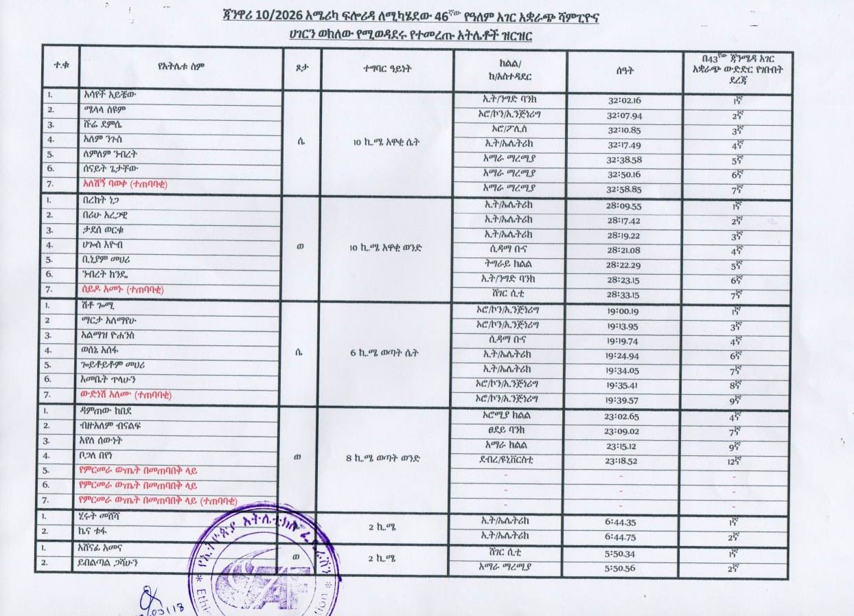 ጃንዋሪ 10/2026 አሜሪካ ፍሎሪዳ ለሚካሄደው 46ኛው የዓለም አገር አቋራጭ ሻምፒዮና ላይ ሀገርን ለመወከል የጠመረጡ ፤